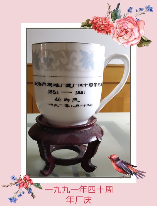 記憶二:陶瓷水杯——1991年金猴創立40周年時企業為職工定制的專屬陶瓷水杯。1989年威海市二輕工業局改組了威海市皮鞋廠領導班子,年輕的帶頭人柳富林廠長新官上任點燃了三把火:一是抓拳頭產品,重獎設計人員;二是拓展銷售市場,打開產品渠道;三是擴大企業規模,提升生產能力。到1991年四十周年廠慶的時候,企業已經擺脫了困境,技術、銷售、生產三條戰線處處充滿生機和活力,企業取得了長足的發展。這一年,企業合并了“威海市皮鞋材料廠”,“威海市皮鞋廠”改名為“威海市皮鞋工業集團公司”。為了鼓勵廣大干部職工這種火熱的工作激情,工廠派專人到中國四大瓷都之一的淄博,為每位干部職工定制了這款專屬陶瓷水杯。這個陶瓷水杯“白如玉,明如鏡,薄如紙,聲如磐”,是一件非常精美且具有紀念意義的陶瓷制品。