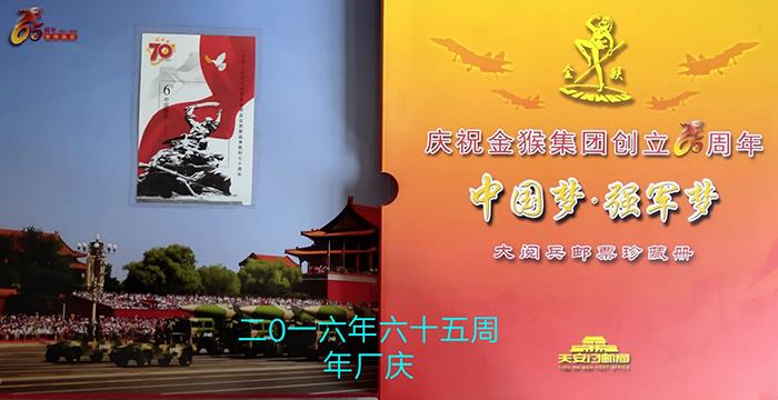 記憶五:大閱兵郵票珍藏冊——2016年金猴創立六十五周年華誕時企業給職工發的精美大閱兵郵票珍藏冊。在過去的五年時間里,企業面對殘酷的市場競爭,披荊斬棘,乘風破浪,內銷出口兩翼齊飛,軍民融合發展得到了進一步的拓展。企業連年躋身“中國皮革行業10強業”、“中國輕工業100強企業”、“中國民營企業500強”、“中國制造業企業500強”行列。公司技術中心被認定為“國家級工業設計中心”,為企業插上了騰飛的翅膀。公司堅持深化軍民融合戰略,2015年在中國人民抗日戰爭暨世界反法西斯戰爭勝利70周年大閱兵上,金猴產品再次為“9.3大閱兵”增添風采,公司還被閱兵聯合指揮部授予“閱兵保障突出貢獻獎”。2016年公司被中共山東省委、山東省人民政府、山東省軍區授予“山東省愛國擁軍模范單位”,體現了黨委、政府和軍隊對公司為國防軍隊建設做出貢獻的充分肯定。為了永遠銘記金猴集團保障的兩次大閱兵激動人心的美好瞬間,助力國家實現中國夢強軍夢的偉大征程,金猴集團策劃制作了這本“中國夢?強軍夢”大閱兵郵票珍藏冊。這是一本珍貴精美的郵票冊,里面收藏了幾十枚珍貴稀有的郵票,發給全體在職和離退休干部職工,作為永遠的紀念。