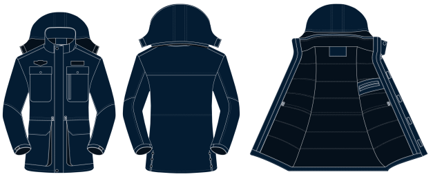 2、領子為立領結構;袖子為3片式分割,袖口處绱有袖袢,袖袢上有粘扣帶調節袖口大小,袖肘處有4個省縫,用于增加活動量;帽子為可拆卸式,有拉鏈固定,帽子前端可放入領子內,用粘扣帶固定;